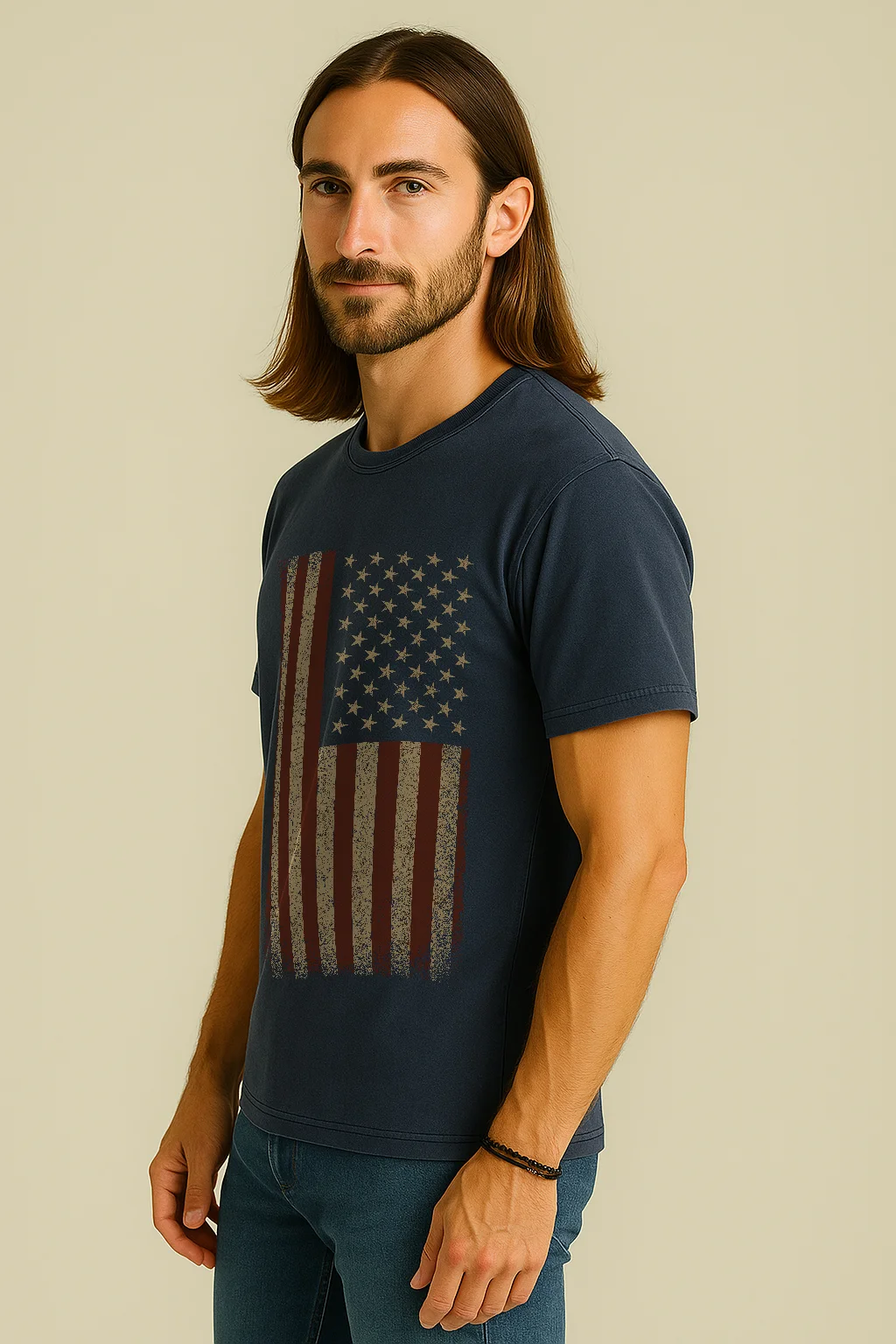 Show your patriotism with a vintage twist in this Distressed American Flag T-Shirt. Featuring a rugged, weathered flag design in muted red, tan, and demin tones, this tee offers a bold yet understated tribute to the American spirit.